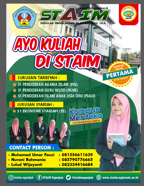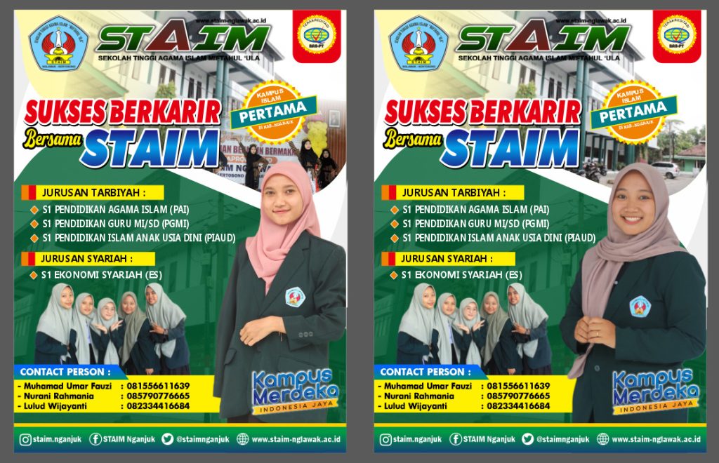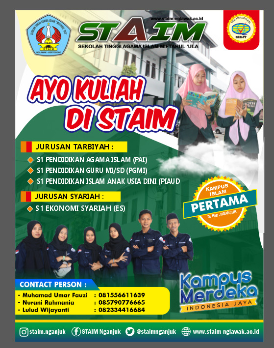 Gak perlu pikir panjang lagi deh, Ayuk raih masa depan gemilang bersama STAIM Nganjuk! Dosen nya ramah. Kampusnya asri dan dekat lingkungan pesantren. Lulusannya selalu menjadi yang terbaik di masyarakat. InsyaAllah… Berkah ilmunya lho.